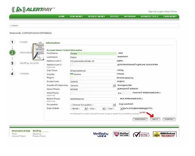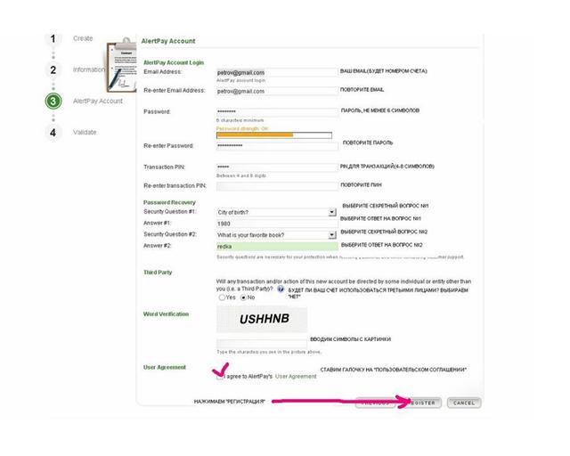 AlertPay, этот почтовый адрес и пароль вы будете использовать для входа в